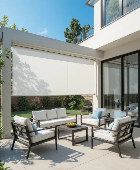 Outdoor roller shades can be installed along the sides of a patio or pergola. These shades block direct sunlight and reduce glare while still allowing fresh air to circulate.