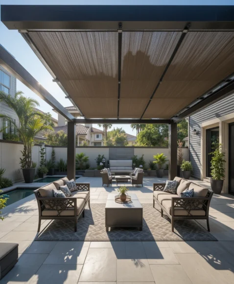 A sliding fabric canopy system allows you to adjust the shade across a pergola or patio frame. It can be opened or closed depending on how much sunlight you want.