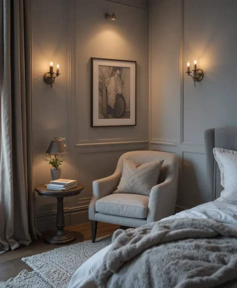 Neutral tones promote relaxation. Beige and soft gray work well. This nook blends seamlessly with the bedroom.